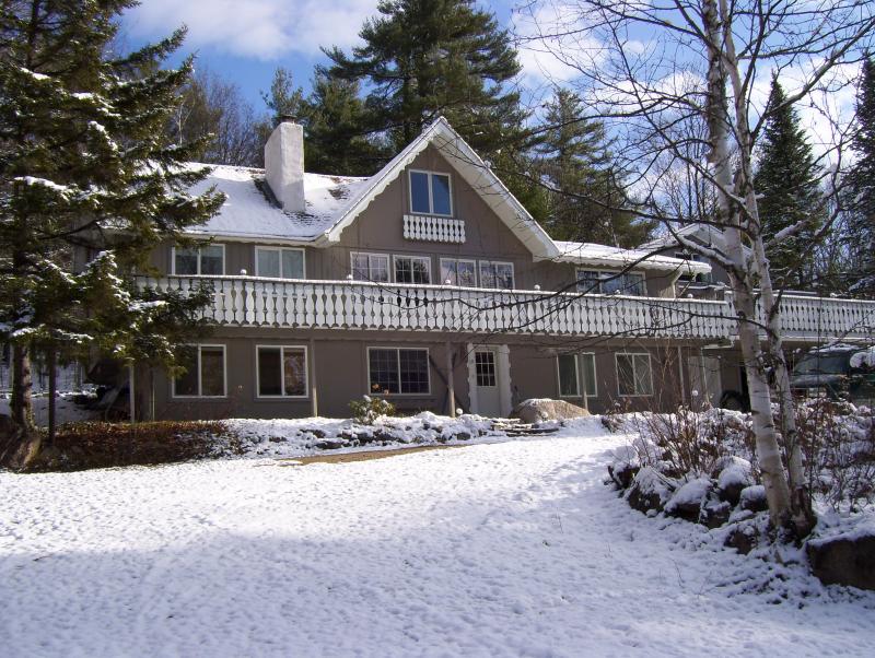 The Beast is located on the side of Mount Surprise facing West toward the Moat Mountains in a quiet forested residential neighborhood of vacation homes. The house was enlarged several times giving it an unconventional design with its 10 bedrooms and 9 bathrooms divided into 4 areas: North Wing, Great Room, South Wing and Ground Floor. This layout enables both privacy and large common areas for family entertainment and dinning.